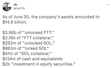 According to the document obtained by CoinDesk, as of June, 30, Alameda Research had $14.6 billion in assets and $8 billion in liabilities. FTT, a native token of the FTX exchange, accounted for one third of its holdings, or $5.82 billion of its assets. Inside this category of the firm's balance sheet, there are $3.66 billion of “unlocked FTT” and $2.16 billion of “FTT collateral”. Other assets include Solana (SOL), equity securities, and cash.