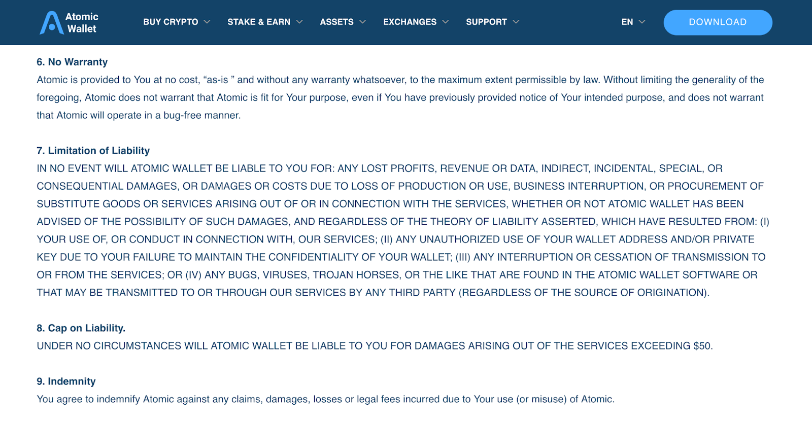 Atomic is a noncustodial-decentralized wallet, placing the responsibility for assets stored in the application on the users themselves. As usual, its Terms of Service explicitly state Atomic Wallet does not accept liability for any on-chain damages experienced by users. And if that doesn't sound mocking enough, an excerpt from the terms clarifies that Atomic Wallet's maximum liability for damages arising from the use of their services is limited to $50.
