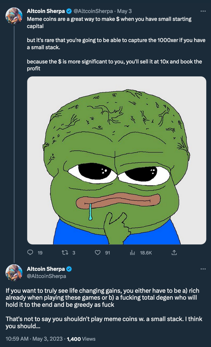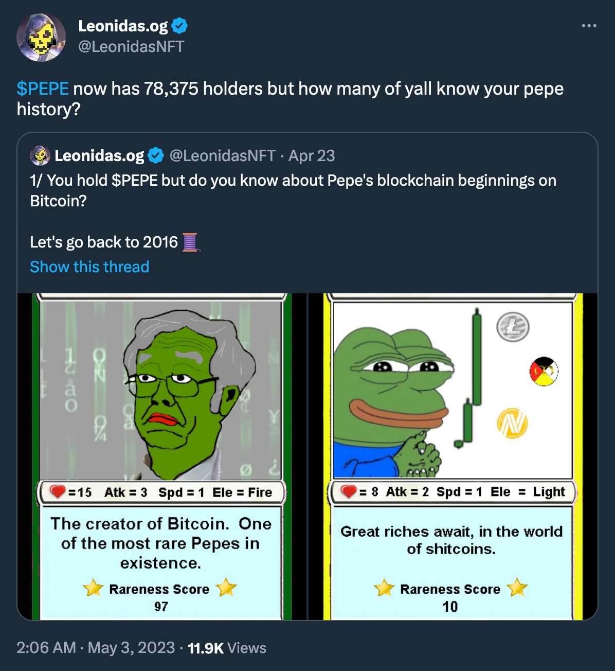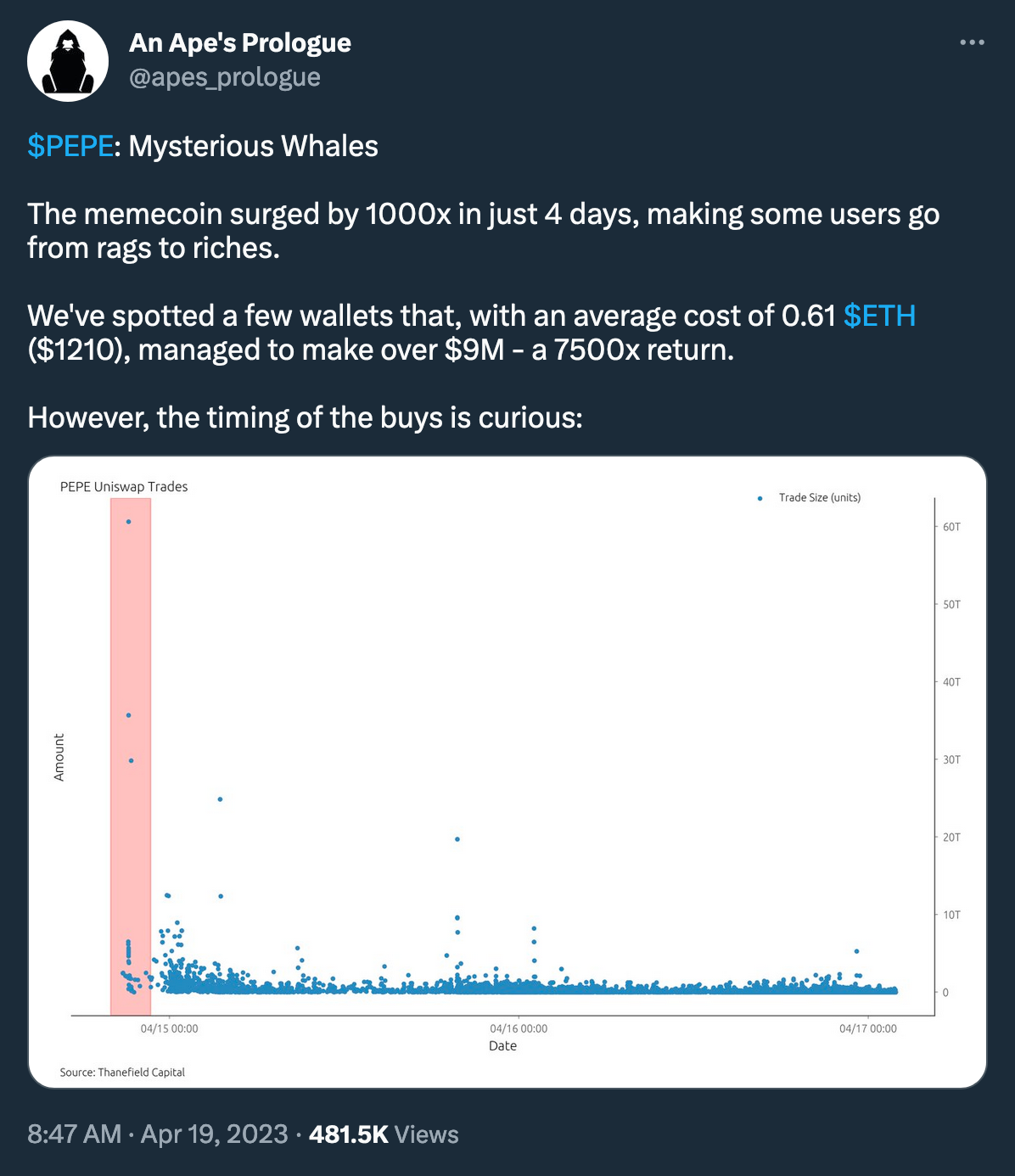 The quirky token gained traction among traders due to its association with @Matt_Furie's famous internet meme character Pepe the Frog – as well as the trend for memecoins and aggressive promo campaign, of course.