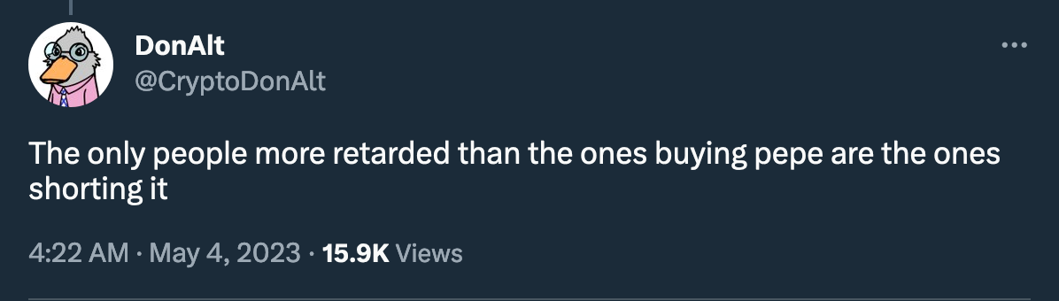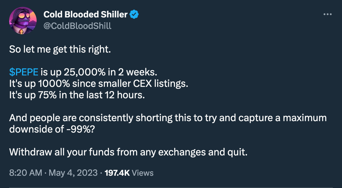 These concerns, however, didn't stop several major exchanges (incl. OKX, Huobi, Bitget, and MEXC) from adding $PEPE to their listings and its price from skyrocketing by thousands of percent. Because healthy and fun degen gambling has all the rights to existing, too.