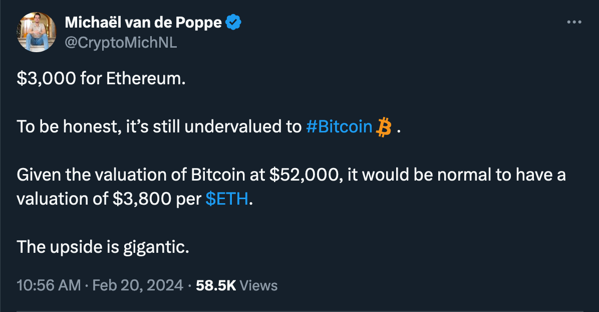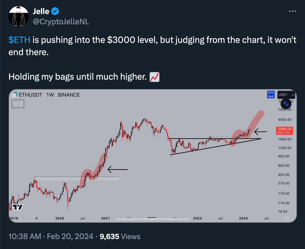 The ether (ETH) surpassed the $3,000 mark for the first time since April 2022 on Tuesday, driven by the market's optimism about the potential approval of the first U.S. spot ETH exchange-traded funds (ETFs).