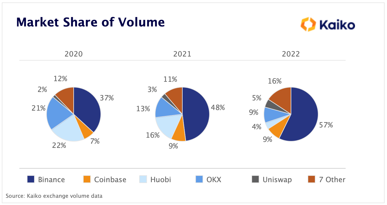 According to CoinRanking, Huobi Global is the 10th largest crypto exchange in the world by trading volume. In 2022, Huobi founder Leon Li sold his 60% stake in the company in a deal with Hong Kong-based investment firm About Capital. TRON founder Justin Sun is rumored to have used About Capital as an intermediary company in order to acquire Huobi. According to Kaiko, Huobi's market share tumbled from 22% in 2020 to just 4% last year. Overall, the market has consolidated significantly with Binance dominating the majority of trade volume relative to both centralized and decentralized exchanges.
