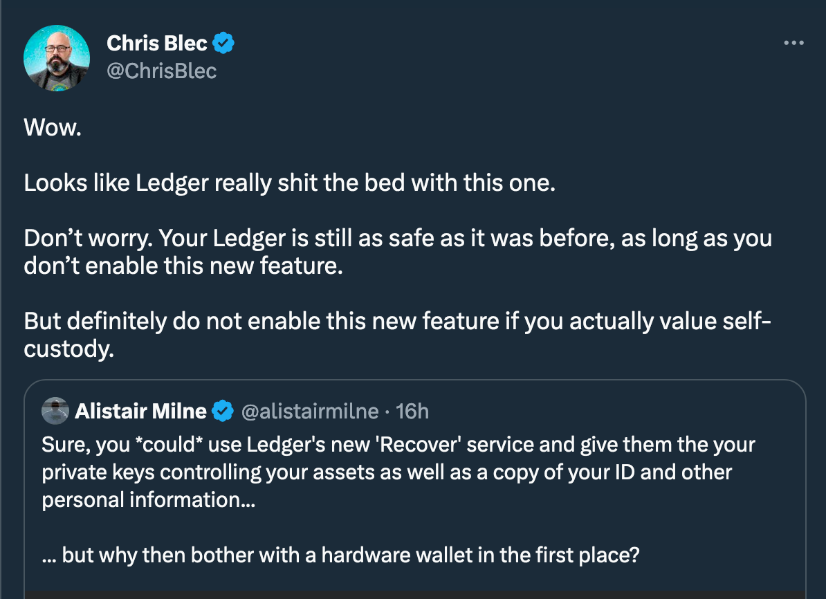 "Sure, you *could* use Ledger's new 'Recover' service and give them your private keys controlling your assets as well as a copy of your ID and other personal information… but why then bother with a hardware wallet in the first place?"