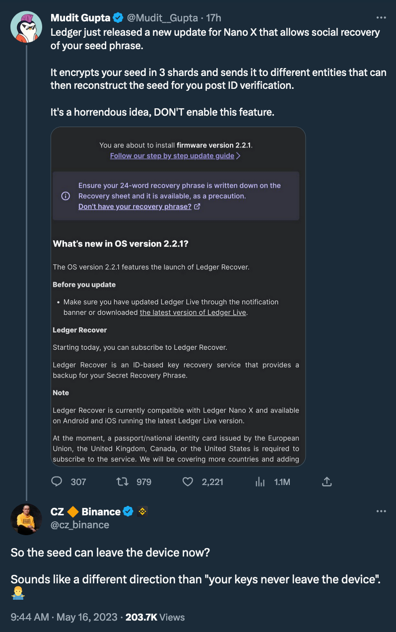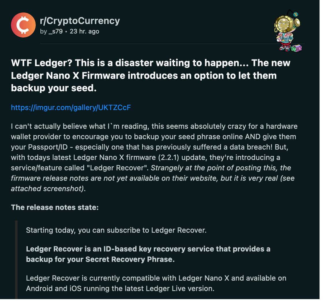 @Ledger crypto wallet presented an "exciting update": a recovery function for the hardware wallet's seed phrase. So why do people seem to be not excited about that?