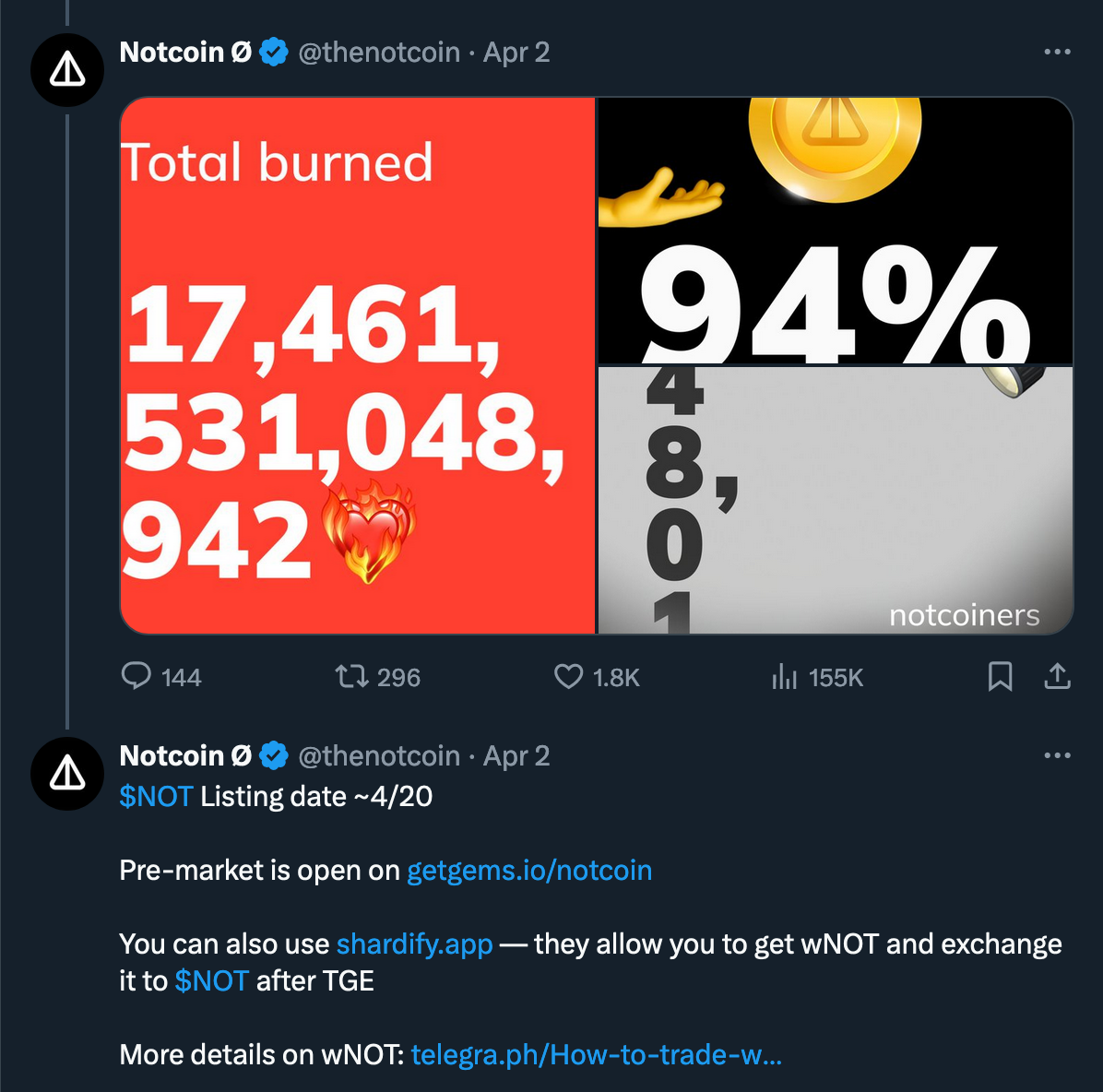 Users, however, can already speculate on the price of the $NOT token, as pre-market trading via NFT vouchers was launched in March. Heavy players who accumulated at least 10 million in-game coins could convert their holdings into NFTs on The Open Network. These NFTs can be traded and will eventually be exchangeable for the on-chain token.