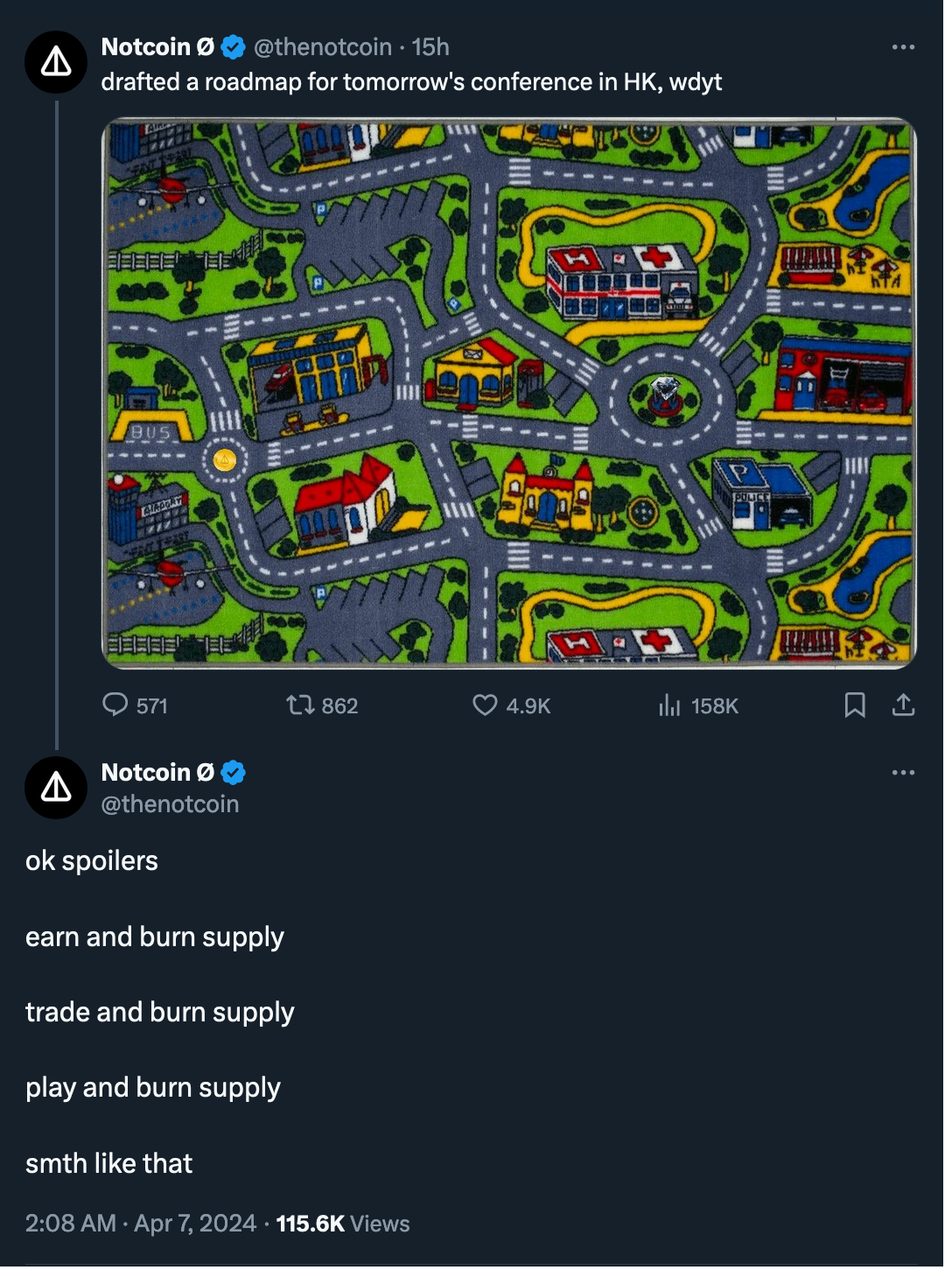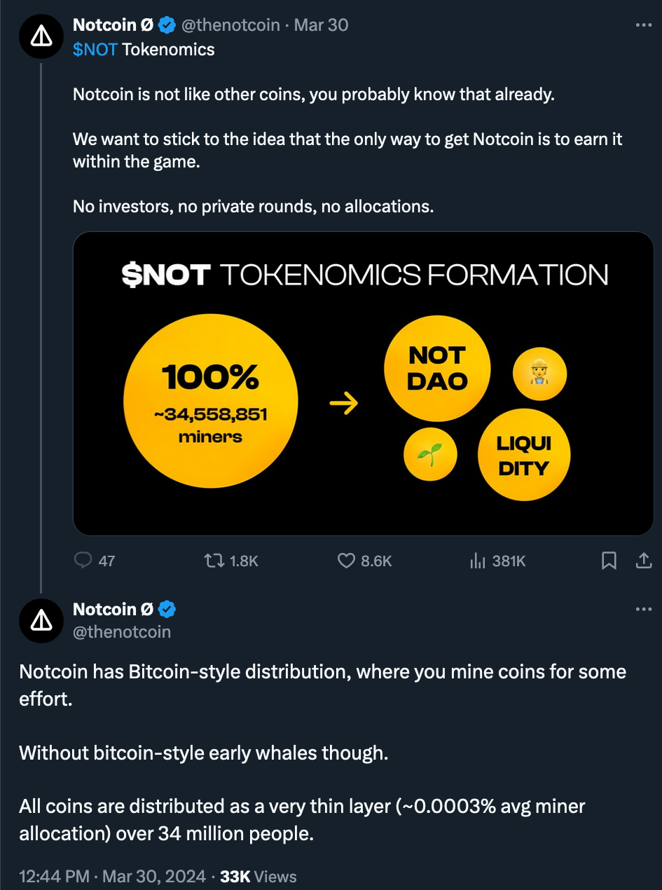 Within the Telegram-based game, players could "mine" or earn in-game Notcoins by tapping on a virtual coin, accumulating in-game currency that will eventually be converted into on-chain, tradable tokens (read here for more details). Since its public launch in January, Notcoin has attracted over 35 million players, with a daily active user count peak of over 6 million.