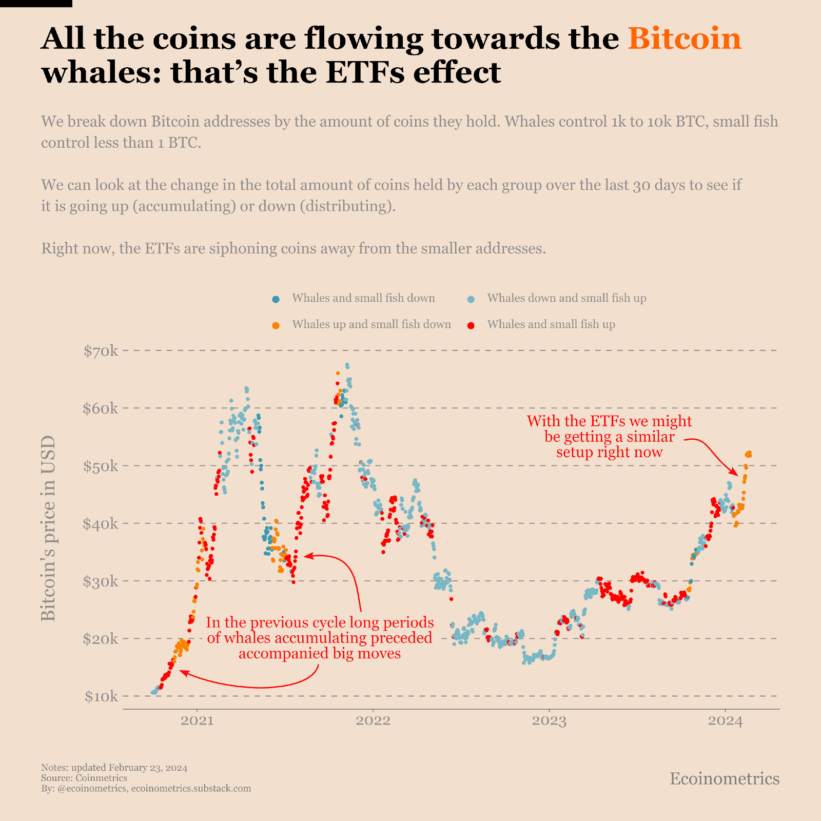 As highlighted by Ecoinometrics, “Every time the whales are accumulating coins (with or without the small fish), Bitcoin’s price is rising significantly.” In recent weeks, there has been a rapid expansion in whale wallets, the fastest since February 2022, as ETFs redirect coins from smaller investors to whales.