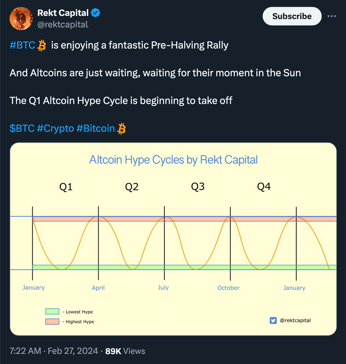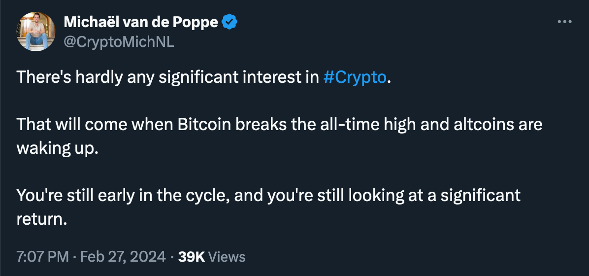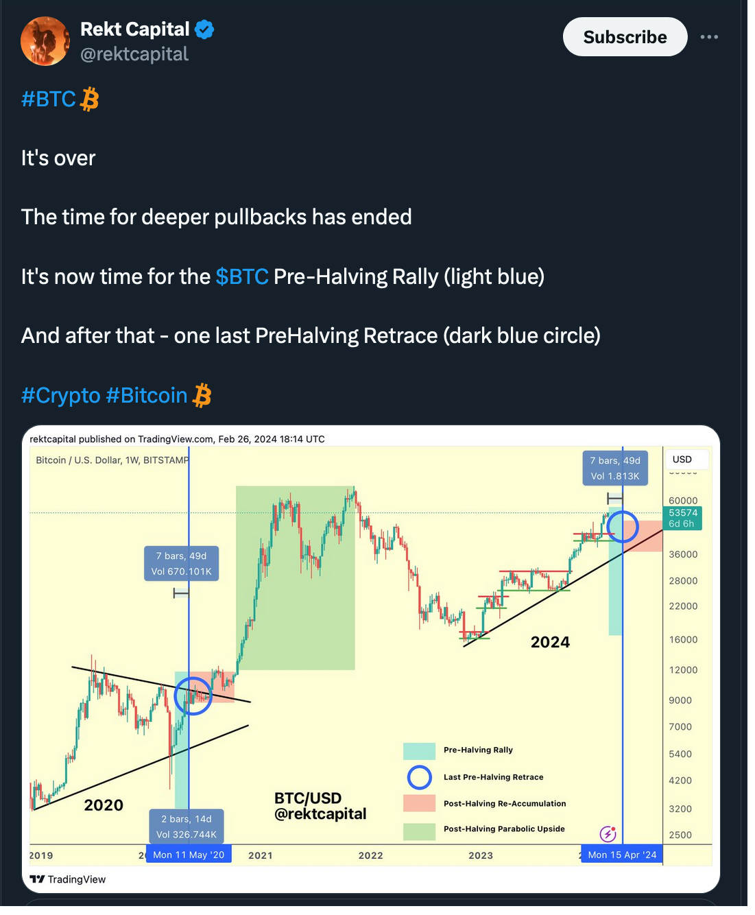 “Right now, ~49 days remain until the April 2024 Halving. … Short-term traders and speculators ‘Buy The Hype’ several weeks before the Halving in anticipation of making a profit from this hype-fuelled rally. Then these speculators ‘Sell The News’ to realise that profit, contributing to a Pre-Halving retrace which occurs only a handful of weeks before the Halving event itself.” (@rektcapital)